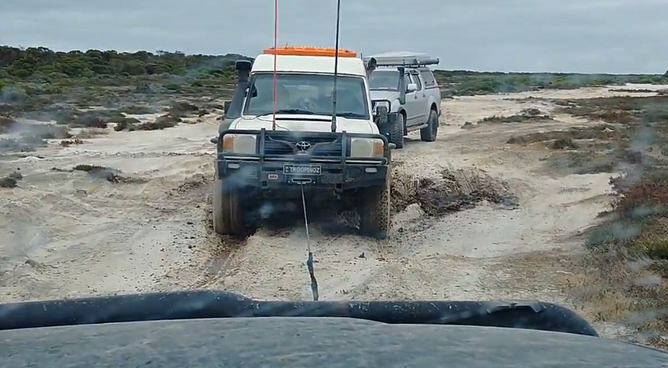 From Israelite Bay to the exit of Cape Arid National Park there are mudflats, mud holes and many fun obstacles along the way. This was a wet drive with a few deep holes. Brad went through a mud hole again in 2WD and got stuck. This time we used a winch for the recovery. Craig set up the camera to record it. Within minutes we had Brad out and continued on.
