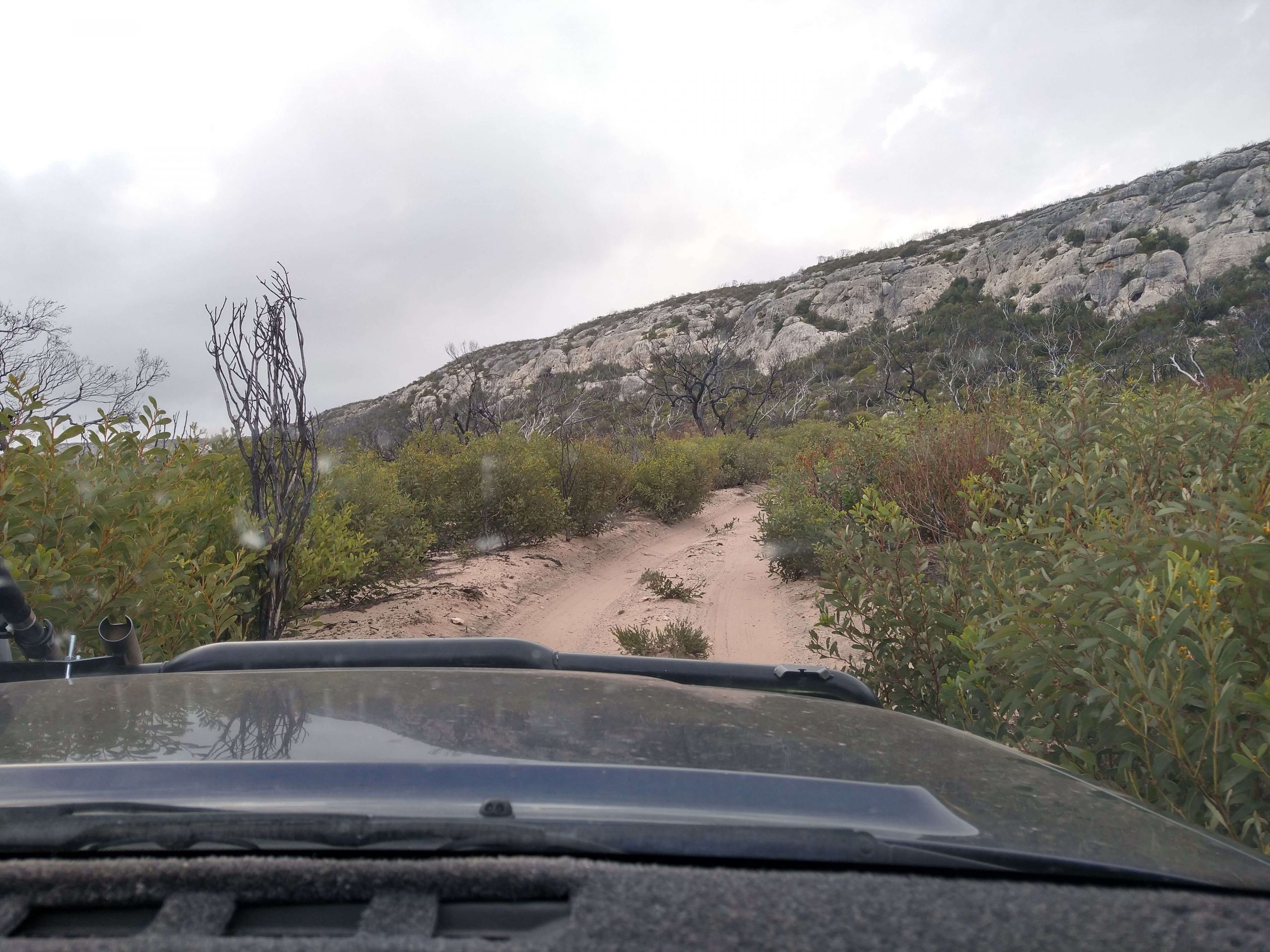 As we got closer to the campsite we noticed the bush was changing from being thick, green and lush to burnt-out desolation. Recent lightning strikes in the area had burnt it out. As we drove through the entrance to Wattle Camp it was clear this was not going to be a suitable campsite for the night. The burnt-out shrubs and trees were not enough to block the wind and protect us from the elements.