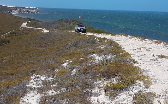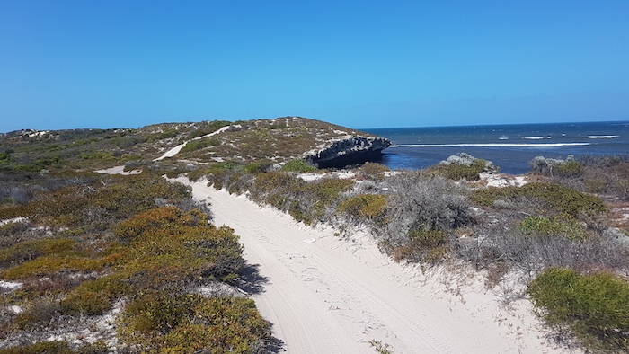 Our way was blocked on the beach 2.5 kilometres north of Coolimba so we returned to the shacks and access track and drove out to Indian Ocean Drive. Ten kilometres north we turned into Gum Tree Bay and pushed north along the coast. The track led us into an extensive dune system through which we were unable to find a way north.